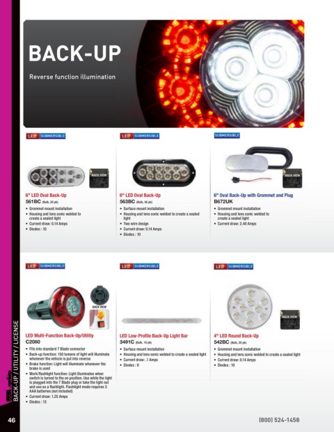 BACK-UP / UTILITY / LICENSE LED Multi-Function Back-Up/Utility LED Low-Profile Back-Up Light Bar 4" LED Round Back-Up